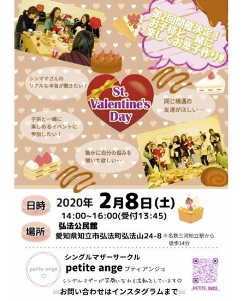 2/8 愛知県・知立市で「親子でお菓子作り」開催します! 主催は 2019年10月に発足したばかりの シングルマザーサークル petite ange(プティ アンジュ) 。 シングルマザーの居場所作り ・若さ故の不安や悩みを共有共感できる交流の場 ・子育てしやすい地域づくり をコンセプトに主に三河地区で活動しているマジメなシンママサークルです。 今回は「親子でお菓子作り」です。 ●日時:2020年2月8日(土) ●時間:14時スタート 2時間程度 ●場所:愛知県・知立市「弘法公民館」 愛知県知立市弘法町弘法山24-8 ※名鉄三河
