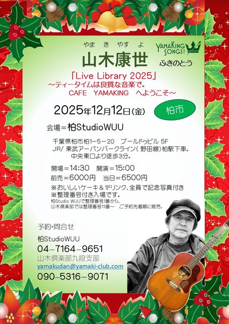 「山木康世 Live Library 2025」 〜ティータイムは良質な音楽で。CAFE YAMAKING へようこそ〜 会場=柏StudioWUU 千葉県柏市柏1-5−20 プールドゥビル 5F JR/ 東武アーバンパークライン( 野田線)柏駅下車。中央東口より徒歩3分。 開場=14:30 開演=15:00 前売=6000円 当日=6500円 ※おいしいケーキ&1ドリンク、全員で記念写真付き ※整理番号付き入場です。 柏Studio WUUで整理番号1番から、山木倶楽部では整理番号11番〜 ご予約先着順に販売。 予約・問合せ 04−7164−96
