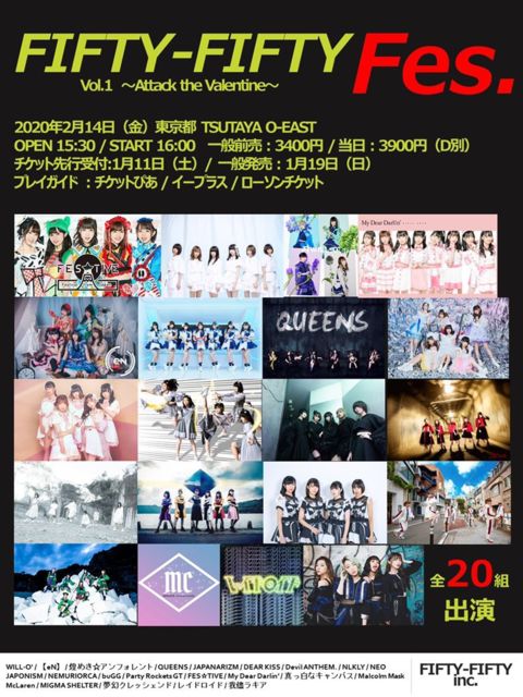 ¡ÖFIFTY-FIFTY Fes Vol.1 ¡ÁAttack the Valentine¡Á¡× Æü»þ¡§02/14(¶â) ³«¾ì15:30 / ³«±é16:00 ²ñ¾ì¡§½ÂëTSUTAYA O-EAST ÎÁ¶â¡§Á°Çä3,400±ß / ÅöÆü2,500 (DÊÌ600±ß) ¢¨ºÆÆþ¾ì²Ä(Í×1D) ½Ð±é¡§WILL-O¡Ç/¡ÚeN¡Û/ßê¤á¤¡ù¥¢¥ó¥Õ¥©¥ì¥ó¥È/QUEENS/JAPANARIZM/DEAR KISS/Devil ANTHEM./NLKLY/NEO JAPONISM/NEMURIORCA/buGG/Party Rockets GT/FES¡ùTIVE/MyDearDarlin¡Ç/¿¿¤ÃÇò¤Ê¥¥ã¥ó¥Ð¥¹/Malcolm Mask McLaren/MIGMA SHELTER/Ì´¸¸¥¯¥ì¥Ã¥·¥§¥ó¥É/¥ì¥¤¥É¥í¥¤¥É/²æÐ֥饥¢ ¥Á¥±¥Ã¥È°ìÈÌȯÇä¡§01/19(Æü) 11:00¡Á https://eplus.jp/sf/detail/31926