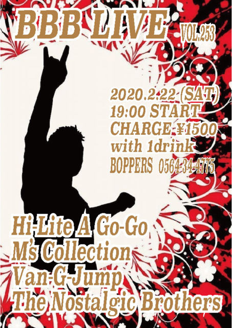 BBB LIVE 253 2020.2.22 (SAT) 19:00 START CHARGE \1500 with 1drink Hi-Lite A Go-Go M's Collection Van-G-Jump The Nostalgic Brothers