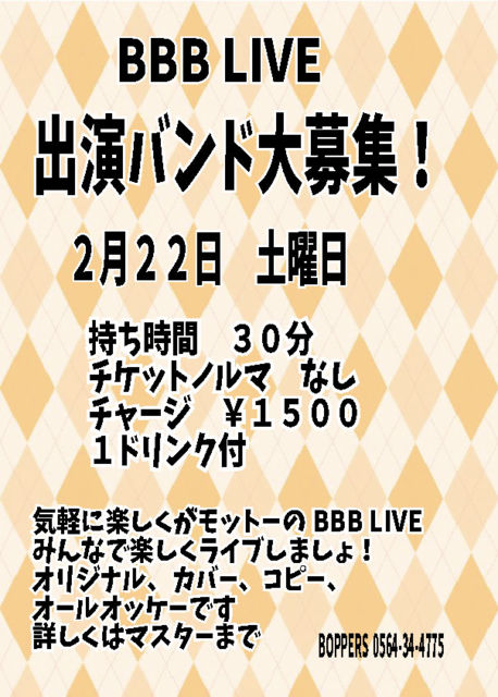 BBB LIVE ½Ð±é¥Ð¥ó¥ÉÂçÊ罸¡ª £²£°£²£°Ç¯¡¡£²·î£²£²Æü¡¡ÅÚÍËÆü »ý¤Á»þ´Ö¡¡£³£°Ê¬ ¥Á¥±¥Ã¥È¥Î¥ë¥Þ¡¡¤Ê¤· ¥Á¥ã¡¼¥¸¡¡¡ï£±£µ£°£° £±¥É¥ê¥ó¥¯ÉÕ¤ µ¤·Ú¤Ë³Ú¤·¤¯¤¬¥â¥Ã¥È¡¼¤ÎBBB LIVE ¤ß¤ó¤Ê¤Ç³Ú¤·¤¯¥é¥¤¥Ö¤·¤Þ¤·¤ç¡ª ¥ª¥ê¥¸¥Ê¥ë¡¢¥«¥Ð¡¼¡¢¥³¥Ô¡¼ ¥ª¡¼¥ë¥ª¥Ã¥±¡¼¤Ç¤¹ ¾Ü¤·¤¯¤Ï¥Þ¥¹¥¿¡¼¤Þ¤Ç