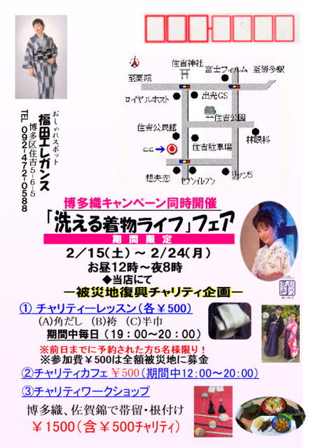 「博多織キャンペーン」同時開催 「洗える着物ライフ」fair 力併せ 祈り続けて叶えたい 被災地復興! きもの復興♡ English below... 期間・・・2月15日(土)〜24日(月・祭)10日間限定 お昼12時〜夜8時迄 会場・・・「福田エレガンス」 福岡市博多区住吉5−6−5 (TEL)092−472−0588 住吉神社前「ロイヤルホスト」横、 小柳通り沿い「住吉公民館」1軒隣 「住吉ハイツ」1階にある 赤いテントのアットホーム