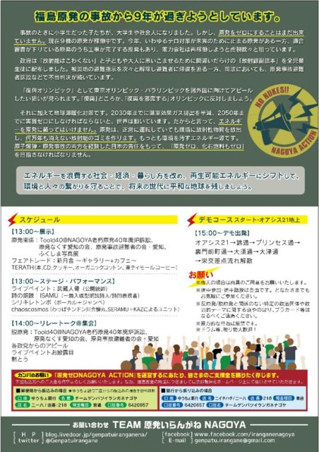 ¡ÚÆü»þ¡Û 2020ǯ3·î8Æü(Æü)¢¨±«Å··è¹Ô ¡ÚŸ¼¨¡¦¥¤¥Ù¥ó¥È¡Û13:00 ¡Ú½¸²ñ³«»Ï¡Û 14:00 ¡Ú¥Ç¥â½Ðȯ¡Û 14:46ÌÛÅø¤Î¸å¡¢15:00 ¡Ú½¸¹ç¾ì½ê¡Û ¥ª¥¢¥·¥¹21(ÃϾåÉô) ¡Ú¸òÄÌ¥¢¥¯¥»¥¹¡Û Ãϲ¼Å´Å컳Àþ¡¦Ì¾¾ëÀþ¡Ö±É¡×±Ø¤ÎÅì²þ»¥¸ý¤ò½Ð¤Æ¤¹¤°ÃÏ¾å ¡Ú¼çºÅ¡Û ¸¶È¯¥¼¥íNAGOYA ACTION ¡Ò¸Æ¤Ó¤«¤±¡Ó Ê¡Å縶ȯ¤Î»ö¸Î¤«¤é9ǯ¤¬²á¤®¤è¤¦¤È¤·¤Æ¤¤¤Þ¤¹¡£»ö¸Î¤Î¤È¤¤Ë¾®³ØÀ¸¤À¤Ã¤¿»Ò¤¿¤Á¤¬¡¢Âç³ØÀ¸¤ä¼Ò²ñ¿Í¤Ë¤Ê¤ê¤Þ¤·¤¿¡£¤·¤«¤·¡¢¸¶È¯¤ò¥¼¥í¤Ë¤¹¤ë¤³¤È¤Ï¤Þ¤À½ÐÍè¤Æ¤¤¤Þ¤»¤ó¡£¸½ºß¡¢9µ¡¤Î¸¶È¯¤¬²ÔÆ¯Ãæ¤Ç¤¹¡£º£Ç¯¡¢¤¤¤ï¤æ¤ë¥Æ¥íÂкö¤¬Ì¤´°¤Î¤¿¤á¤Ë»ß¤Þ¤ë¸½ºß¤¬¤¢¤ë°ìÊý¡¢Å¬¹ç¿³ºº¤¬