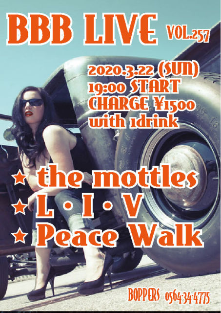 BBB LIVE 257 2020.3.22 (SUN) 19:00 START CHARGE \1500 with 1drink the mottles L¡¦I¡¦V Peace Walk