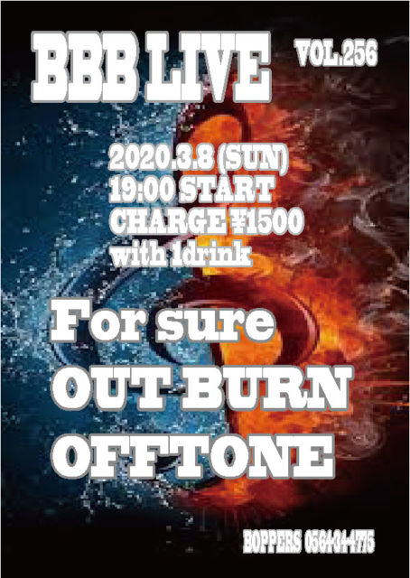 BBB LIVE 256 2020.3.8 (SUN) 19:00 START CHARGE \1500 with 1drink For sure OUT BURN OFFTONE
