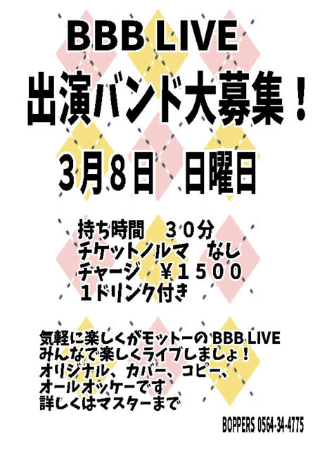 BBB LIVE ½Ð±é¥Ð¥ó¥ÉÂçÊ罸¡ª £²£°£²£°Ç¯¡¡£³·î£¸Æü¡¡ÆüÍËÆü »ý¤Á»þ´Ö¡¡£³£°Ê¬ ¥Á¥±¥Ã¥È¥Î¥ë¥Þ¡¡¤Ê¤· ¥Á¥ã¡¼¥¸¡¡¡ï£±£µ£°£° £±¥É¥ê¥ó¥¯ÉÕ¤ µ¤·Ú¤Ë³Ú¤·¤¯¤¬¥â¥Ã¥È¡¼¤ÎBBB LIVE ¤ß¤ó¤Ê¤Ç³Ú¤·¤¯¥é¥¤¥Ö¤·¤Þ¤·¤ç¡ª ¥ª¥ê¥¸¥Ê¥ë¡¢¥«¥Ð¡¼¡¢¥³¥Ô¡¼ ¥ª¡¼¥ë¥ª¥Ã¥±¡¼¤Ç¤¹ ¾Ü¤·¤¯¤Ï¥Þ¥¹¥¿¡¼¤Þ¤Ç