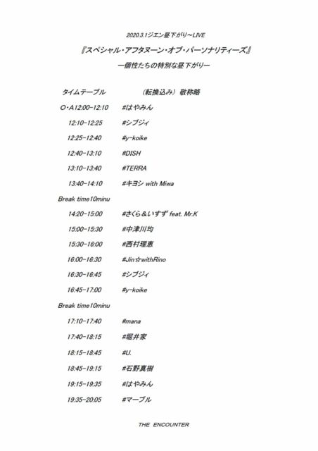 −−−−−−−−−−− ●2020年3月1日(日) 【The-encounter】 岐阜県羽島市正木町新井741 http://the-encounter.info 〈〈Vol.54 ジエン昼下がりライブ〜〉〉 ◆時間 OPEN 11:30/START 12:00 ◆料金 ¥1000 (飲食物持ち込み可) ◆出演 添付画像参照