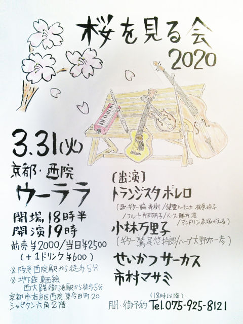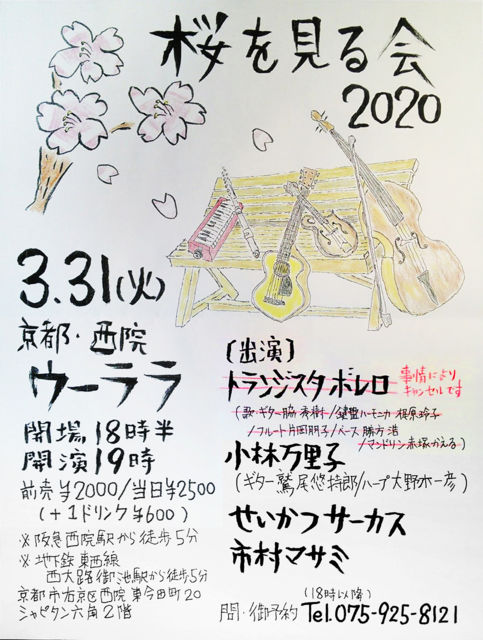 3月31日の西院ウーララでの「桜を見る会2020」ライブですが、 コロナの影響でトランジスタボレロさんが出演を辞退されることになり、 残念ながら残りの3組での出演となりました。 ギターボーカルの脇秀樹さんにせっかくエスプリの効いたフライヤーまで作成していただいてたのですが、 脇さんはじめバンドメンバーの方々の職場のご事情もあっての苦渋のご決断だったとのことです。 実は3月15日のコーナーストーンバーでのライブですが、 そこにおいてもビーロキシーズのサックス奏者、村山順平さんが 周囲に高齢者や免疫抑制剤を飲んでるご家族