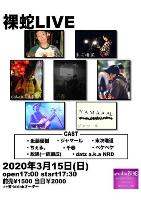 BAND LIVE "¥Ï¥¤¥Ö¥ê¥Ã¥É ¥Ð¥È¥ë ¥Ä¥¢¡¼2020" ¡ú3/21(ÅÚ)Ĺºê:ëÝÁáÍç¼Ø OPEN 18:30/START 19:00 ADV \2300/DOOR \2800(¶¦¤Ë¥É¥ê¥ó¥¯ÂåɬÍ×) <CAST> ¡¡¡¡¥±¥ê¡¼¥Þ¥Õ ¡¡¡¡Ë½Áö¥é¥¤¥ó ¡¡¡¡THE HONE HONE ROCKS ¡¡¡¡°ÆÁ¥¸¥ã¥ó¥°¥ë¥º <TICKET> ¡¡¡¡¥Ð¥ó¥ÉͽÌó ¡¡¡¡D.R.PͽÌó ¡¡¡¡²ñ¾ìŹƬ ¡¡¡¡<Ìä>Íç¼Ø¡¡0957-24-1787