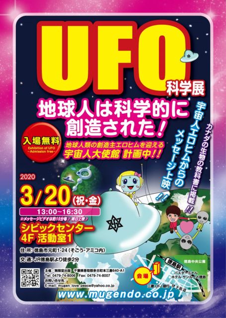 どなた様もご自由にご入場できます♪ お気軽にお越し下さいませ(^-^)/ カナダの生物の教科書に掲載されました エロヒムによる科学的創造論をお伝えいたします。 入場料は無料となっておりますので、お気軽にご参加下さいませ。 <主催:無限堂> 日時:3月20日(祝・金) 開演13:00 終演16:30(常時開催) 場所:〒770-0834 徳島市元町1丁目24番地(そごう・アミコ内)シビックセンター4F 活動室1 http://www.civic-center.jp/rent 交 通:JR徳島駅より徒歩2分 地図:http://www.mapfan.com/m.cgi?