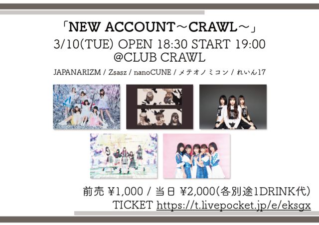 ¡ÖNEW ACCOUNT¡ÁCLUB CRAWL¡Á¡× Æü»þ¡§03/10(²Ð) ³«¾ì18:30 / ³«±é19:00 ²ñ¾ì¡§½ÂëCLUB CRAWL ÎÁ¶â¡§Á°Çä1,000±ß / ÅöÆü2,000±ß (DÊÌ) ½Ð±é¡§JAPANARIZM / Zsasz / nanoCUNE / ¥á¥Æ¥ª¥Î¥ß¥³¥ó / ¤ì¤¤¤ó17 ¥Á¥±¥Ã¥È¡§https://t.livepocket.jp/e/eksgx¡¡15Æü18:00¡Á
