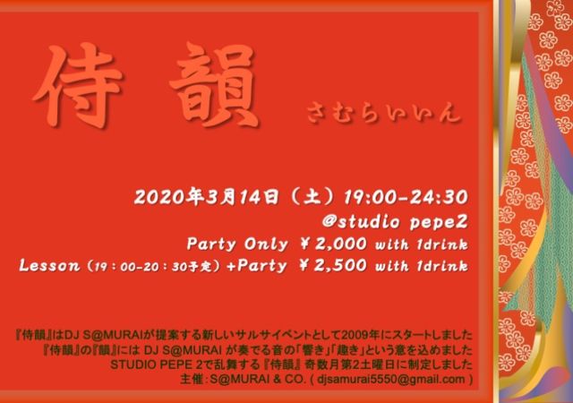 DJ S@MURAIです 新型コロナウイルス感染症のリスクに鑑み、 3/14開催の『侍韻』を中止することと致します。 皆様にはご迷惑をおかけしますが、 ご理解の程よろしくお願い致します。