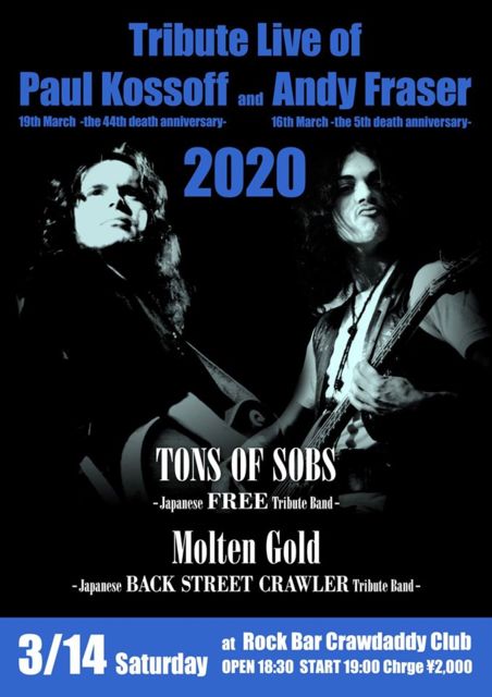 3/14 本日のライブ Tribute Live of Paul Kossoff and Andy Fraser 2020 "TONS OF SOBS" and "Molten Gold" 2Band Live OPEN 18:30 START 19:00 CHARGE 2000円
