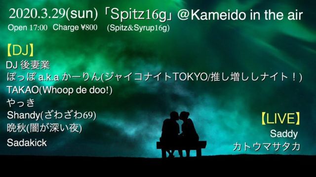 ¡Ú¥¤¥Ù¥ó¥È¤ä¤ê¤Þ¤¹¡Û #spitz16g ¤È¤¤¤¦¥¤¥Ù¥ó¥È¤òµµ¸Íin the AIR¤Ç³«ºÅ¤·¤Þ¤¹¡£ ʼç¥Î¥Ö¤µ¤ó¤Î¥Á¥ç¥¤¥¹¤Ç¡¢¿·Ìھ쥵¥ó¥»¥Ã¥È¤Ç¶¦±é¤·¤¿¤ê¸¤¤¬Ëʤ¨¤ë¤Î̿̾¤ò¤·¤¿¤ê¤È¿ÆÏÂÀ¤Î¹â¤¤¥¹¥Ô¥Ã¥Ä¤Èsyrup16g¥ª¥ó¥ê¡¼¤Î°ìÌë¤Ç¤¹ ÃÆ¤¸ì¤ê¤â¤ª·Þ¤¨¤·¡¢Ç»¤¤ÌܤÎÁª¶Ê¤¬´üÂԤǤ¤Þ¤¹¡£ ÌÞÏÀ¥é¥¤¥È¤Ê¥Õ¥¡¥ó¤âÂç´¿·Þ¡ª ¡Ú³µÍ×¡Û Æü»þ¡§3/29(Æü)17~23»þ ¾ì½ê¡§µµ¸Íin the Air ÁíÉðÀþµµ¸Í±Ø Ë̸ý¤è¤êÅÌÊâ3ʬ ¡Ê¢©136-0071 ÅìµþÅÔ¹¾Åì¶èµµ¸Í2-25-3 ¾®¹õ¥Ó¥ë2F¡Ë ¥Á¥ã¡¼¥¸¡§800±ß ¡Útimetable¡Û 17:00-17:20 ¡¡²»½Ð¤·¡¦¥µ¥¦¥ó¥É¥Á¥§¥Ã¥¯¤ò·ó¤Í¤¿