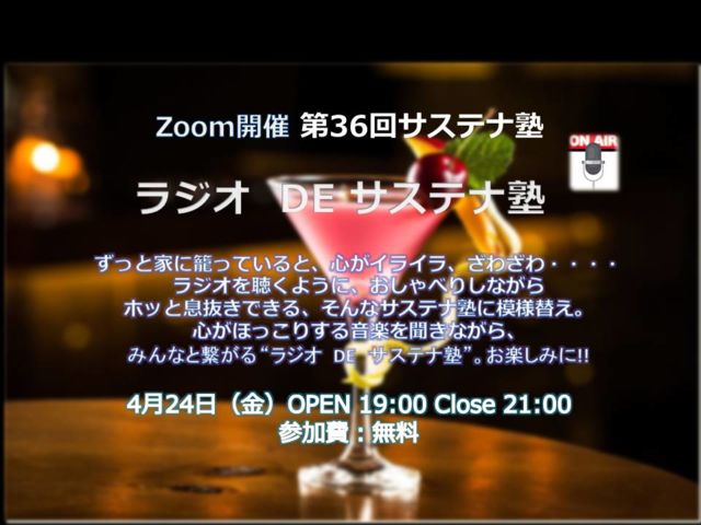 元気になりたい!心を落ち着かせたい!誰かと話がしたい!心がほっこりする音楽を聞きながら、最近のトピックスやこの状況をチャンスに変えるアイディアMTG、ちょっとためになる雑学などなど「ラジオDEサステナ塾」と題してみんなと繋がる時間に。 第36回サステナ塾/ラジオDEサステナ塾(2020/4/24金19時〜) https://www.facebook.com/events/902335080225232 •パーソナリティー:森裕美子 ************ 新型コロナウイルスの感染が拡大して、不要不急の外出を自粛するよう強く叫ばれ、学校は休校、会社は在宅ワークに。