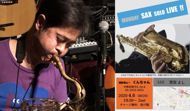 「ジャズを聴きたい人、演りたい人、歌いたい人が気軽に楽しめる宴」をコンセプトに2年間にわたって毎月開催していた観客参加型ライブ『月曜じゃず会』の主催のサックス奏者・宮田よしさんが、新たなライブをスタートさせます。 基本的には、「よしさんと遊ぼう!」的なイメージで、よしさんがルーパーなどを使ったサックスの独演を中心に、時にはゲストを迎えてのライブ、お客さんとのセッションなど、実験的なことや、その時の雰囲気で自由に展開していこうという、いわば“フリースタイル”ライブです。 ライブ配信なども考えているようです。
