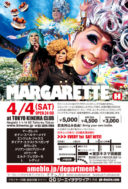 アバンギャルドなクラブパーティーです。 4月4日第1土曜日デパートメントH 2099 open 24:00 @鶯谷東京キネマ倶楽部http://www.kinema.jp 03−3874−7988 ¥5000/ ¥4500フライヤー持参/ ¥3000ドレスコード 飲食持込自由。会場内でアルコール類の販売はしておりません。 男女更衣室有り。 写真付IDチェック有り。 https://mixi.jp/view_event.pl?comm_id=36042&id=93276032 https://ameblo.jp/department-h/entry-12584477925.html 予告編https://togetter.com/li/1478464 前回のあらましhttps://t