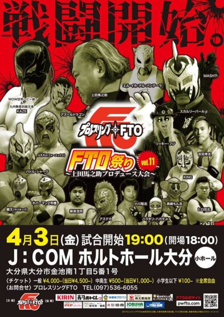 【FTO祭りvol.11〜上田馬之助プロデュース大会〜】 4.3(金)J:COM ホルトホール大分 大分市金池南1丁目5番1号 《試合開始》 19:00(開場18:00) 《チケット》 前売 一般 \4.000- 中高生 \500- 小学生 \100- (当日 \500-増) ※全席自由 《お問い合わせ》 プロレスリングFTO 097-536-6055 公式サイト pwfto.com