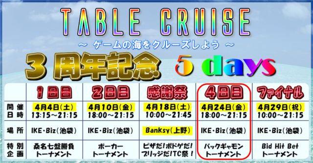 〜 ゲームの海をクルーズしよう 〜 ボードゲーム、カードゲーム、いろいろと取り揃えています。 (※詳しくは、遊べるゲーム欄をご覧ください。) ボードゲームの持参、大歓迎です。 「様々なゲームをクルーズするように渡り歩く」 これをテーマに立ち上げたこの会も、この4月で3周年を迎えました!! これからも、精力的に活動していこうと考えております。 みなさま、どうぞ遊びにいらしてください。 さて、3周年4日目はバックギャモントーナメントを行います!! もちろん。いつも通り他のゲームも遊べます。 ----------