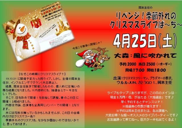 ●概要 岡本主任の季節外れの「クリスマスライブぱ〜ち〜」 4月25日(土) 大森:風に吹かれて http://oomorikazefuka.weebly.com/ 予約2000 当日2500 (+オーダー) 17:00/18:00 出演:クリスマスツリーマン、プラズマー小野沢、ウルルJUN、さとうGO!、岡本主任 ●なぜこの時期にクリスマスライブ? 19.12.21に開催予定だった同ライブ。しかし、主催の岡本主任がインフルエンザでダウン(外出禁止)。 結果、岡本主任抜きで開催したものの、個人的には悔いの残る結果になりました。 ※内容的にも、抽選会とケーキはなし!