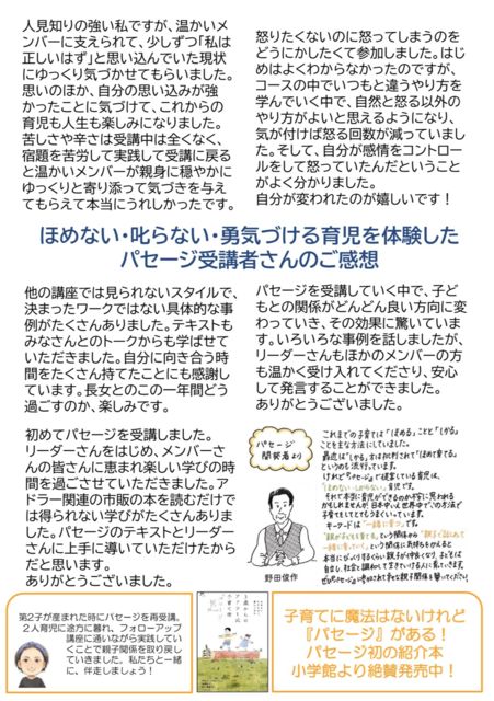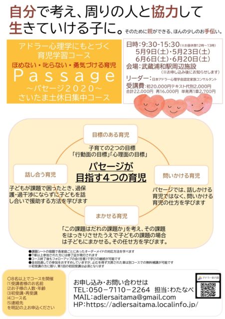 ほめない・叱らない・勇気づける育児 土曜集中コース 5/9・23・6/6・20 9:30-12:00 13:00-15:30 リーダー:日本アドラー心理学会認定家族コンサルタント 受講料:20,000円 テキスト代:2,000円 再受講:16,000円 メンバーと一緒に学んでいきましょう 主催:アドラー彩の国 https://adlersaitama.localinfo.jp/ おすすめ書籍 『3歳からのアドラー式子育て術「パセージ」』 https://adlersaitama.localinfo.jp/pages/3397873/page_201911221618
