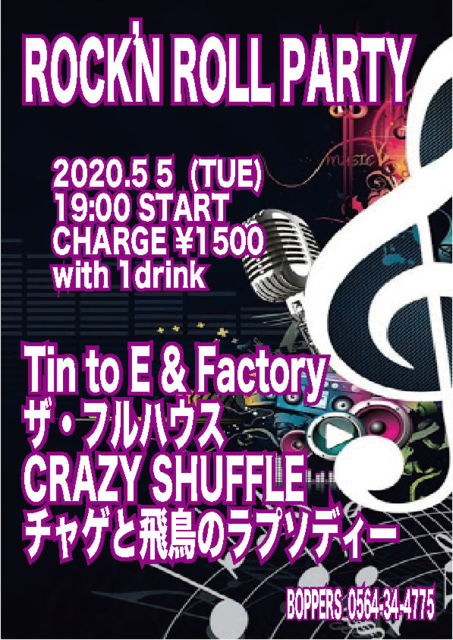 ROCK'N ROLL PARTY 2020.5.5 (TUE) 19:00 START CHARGE \1500 with 1drink Tin to E & Factory ¥¶¡¦¥Õ¥ë¥Ï¥¦¥¹ CRAZY SHUFFLE ¥Á¥ã¥²¤ÈÈôÄ»¤Î¥é¥×¥½¥Ç¥£¡¼