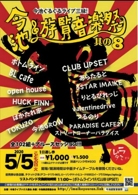Ëèǯ¹±Îã¡¢»Ò¶¡¤ÎÆü¤Ë³«ºÅ¤µ¤ì¤ë1Ëç¤Î¥Á¥±¥Ã¥È¤ò¥ê¥¹¥È¥Ð¥ó¥É¤È¸ò´¹¤·¥ê¥¹¥È¥Ð¥ó¥É¤òÄ󼨤¹¤ë¤ÈÁ´15²ñ¾ì¡¢¥é¥¤¥Ö¸«ÊüÂê¤Ç1ÆüÍ·¤ÓÅݤ»¤ë¥µ¡¼¥¥Ã¥È·¿°ìÂç¥é¥¤¥Ö¥¤¥Ù¥ó¥È¡£ ¢¢5/5(²Ð½Ë) ¡Ú¥¿¥¤¥È¥ë¡Û º£ÃÓÍ·Í÷²»³Úº× ¶¤Î8 ¡Ú»þ´Ö¡Û ¥ê¥¹¥È¥Ð¥ó¥É¸ò´¹³«»Ï»þ´Ö:11»þ¡Á(º£Ãӥܥȥà¥é¥¤¥ó1F¡¢ÃÓ²¼¥¯¥é¥Ö¥¢¥Ã¥×¥»¥Ã¥È¤Ë¤Æ) ¡ÚÎÁ¶â¡Û 1ÆüÄ̤··ô:Á°Çä¡ï1000/ÅöÆü:¡ï1500(Á°ÇäÅöÆü¶¦¤Ë¥ê¥¹¥È¥Ð¥ó¥É¸ò´¹»þ¤ËÍץɥê¥ó¥¯¥Á¥±¥Ã¥ÈÂå¡ï600) ¡Ú²ñ¾ì¡Û BOTTOM LINE/HUCKFINN/TOKUZO/CLUB UPSET/3STAR IMAIKE/valentine drive/BL CAFE/PARADISE CAFE21/¤ê¤È¤ë¤Ó¤ì¤Ã¤¸/G