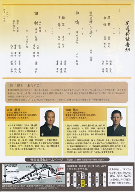 Âè29²óŽ¢ÈøÆ»¿Åǽ¡× Æü»þ¡§ÎáÏÂ2ǯ5·î9Æü(ÅÚ)18:00¡Á20:00º¢ ²ñ¾ì¡§¾ôÅÚ»û¡¢°¤ÌïÂËÆ² (ÈøÆ»»ÔÅìµ×ÊÝÄ®20-28) ¢¨ÈøÆ»±Ø¤è¤êÅÌÊâ25ʬ ÈøÆ»±Ø¤è¤êÅì¹Ô¤¥Ð¥¹Ìó6Ê¬Ž¢¾ôÅÚ»ûŽ£²¼¤Ç²¼¼Ö ¹Åç»ÔÆâ¤è¤ê¥Ð¥¹¥Ä¥¢¡¼¤¢¤ê¤Þ¤¹(¾Ü¤·¤¯¤ÏTel:082-836-5780.MEDELL¥¢¥¯¥¢Å¹¤Ë¤Æ) ±éÌÜ¡§Ç½¡ÖÅļ¡×¡¦Â¾»ÅÉñ4È֤ȶ¸¸À1È֤ȲòÀâ ÎÁ¶â¡§Á°Çä·ô3,500±ß ¡¡ ÅöÆü·ô4,000±ß ¡¡¡¡¡¡³ØÀ¸·ô1,500±ß ¡¡¡¡¡¡¹â¹»À¸°Ê²¼ÌµÎÁ ¢¨ËÜǯ¤è¤ê¥Á¥±¥Ã¥ÈÃÍÃʤ¬ÊѤï¤ê¤Þ¤¹¡£ ¤ªµ¤¤ò¤Ä¤±²¼¤µ¤¤¡£(¿½¤·Ìõ¤´¤¶¤¤¤Þ¤»¤ó) µÈÅÄÆÆ»ËÇÛÌò¡§Ç½Ž¢ÅÄÂ¼Ž£¤Î¥·¥Æ ¤ªÌ䤤¹ç¤ï¤»¡¢¿½¤·¹þ¤ßÀè: T