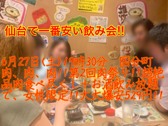 社会人になると新しい出会いも無くなり、仕事・結婚・育児などで交友関係も大きく変化していきます。そんな方たち新しい出会いの場を提供したいと思い立ち上げました。 プライベートや仕事などで悩みを抱えている人も、スマイル会に来れば"みんなが笑顔になれる"そんな会を目指してます。活動記録も載せていますので詳しくはホムペをご覧下さい。仙台 スマイル会 で検索すると出てきますよぉ。 6月25日 木曜日 時間 19時〜22時 3時間企画 会費 男性4000 女性2500 当日500円プラス お友達と参加で500円オフ 定員 20名 場所 分町 牛タン、