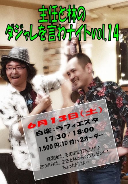 ¡ü³µÍ× £¶·î£±£³Æü¡ÊÅÚ¡Ë Çò³Ú¡§¥é¥Õ¥£¥¨¥¹¥¿ http://www.lafiesta-jazz.jp/ ¼çǤ¤ÈÎӤΡ֥À¥¸¥ã¥ì¤ò¸À¤ï¥Ê¥¤¥ÈVol.14¡× 17:30/18:00 1,500±ß(1DÉÕ)+£²¥ª¡¼¥À¡¼ ¡ü¥¿¥¤¥à¥¹¥±¥¸¥å¡¼¥ë 18:00-18:40¡¡²¬ËܼçǤ¡Ê£Ò£Ã´ØÏ¢¥¹¥Æ¡¼¥¸¡Ë 18:50-19:35¡¡ÎÓ¤¢¤¤Ò¤³ 19:45-20:30¡¡²¬ËܼçǤ ޱŽÝŽºŽ°ŽÙ޾ޝ޼ޮŽÝ ¤Î¸å¤Ï¡¢¤½¤Î¤Þ¤ÞÂǤÁ¾å¤²¡£ ÂǤÁ¾å¤²¤Î¤ª¤Ä¤Þ¤ß¤Ï¡¢¼çǤ¤ÈÎÓ¤«¤é¤Î¥×¥ì¥¼¥ó¥È¡ª ¤Á¤ç¤Ã¤È¤À¤±¤è¡Á(^^;)