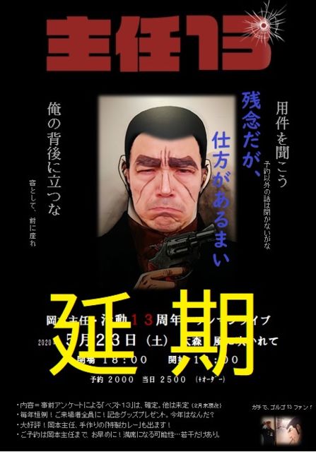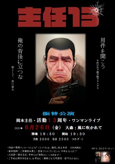 ¡ü³µÍ× ²¬ËܼçǤ¡¦³èư£±£³¼þǯµÇ°¥ï¥ó¥Þ¥ó¥é¥¤¥Ö¡ª¡Ê¿¶Âظø±é¡Ë £¶·î£²£¶Æü¡Ê¶â¡Ë Â翹¡§É÷¤Ë¿á¤«¤ì¤Æ 18:30/19:30 ͽÌó2000 ÅöÆü2500(+޵ްŽÀŽÞް) ¡üÆâÍÆ ¡¦»öÁ°¥¢¥ó¥±¡¼¥È¤Ë¤è¤ë¡Ö¥Ù¥¹¥È£±£³¡×¤Ï³ÎÄꡣ¾¤Ï̤Äê¡£ ¡¦Ëèǯ¹±Î㡪¤´Íè¾ì¼ÔÁ´°÷¤Ë¡ªµÇ°¥°¥Ã¥º¥×¥ì¥¼¥ó¥È¡£º£Ç¯¤Ï¤Ê¤ó¤À¡© ¡¦Â繥ɾ¡ª²¬ËܼçǤ¡¢¼êºî¤ê¤Î¡ÖÆÃÀ½¥«¥ì¡¼¡×¤â½Ð¤Þ¤¹¡ª ¡¦¤´Í½Ìó¤Ï²¬ËܼçǤ¤Þ¤Ç¡¢¤ªÁá¤á¤Ë¡ªËþÀʤˤʤë²ÄǽÀ¡Ä¼ã´³¤À¤±¤¢¤ê¡£ ¡üÃí°Õ»ö¹à ¤³¤Î»þ¤Î¾ðÀª¤Ë¤è¤ê¡Ä ¡¦Ãæ»ß ¡¦¿Í¿ôÀ©¸Â¡Ê¾¯¤ÊÌܡˤǤγ«ºÅ ¤È¤¤¤Ã¤¿¤³¤È¤Ë¤Ê¤ë²ÄǽÀ¤â¤¢¤ê¤Þ¤¹¡£