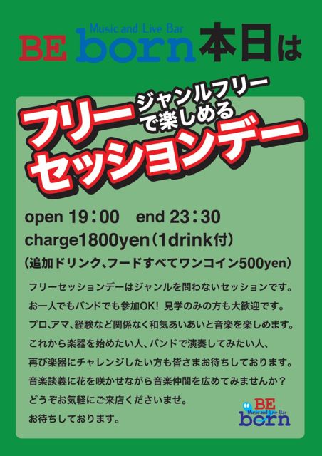 ÎýÇÏmusic & live bar BEborn ºòÆü¤Î¡Ö¤Ê¤Ã¤Á¤ã¤ó¤Î¾¼Ï²ÎÍØ¥»¥Ã¥·¥ç¥ó¡×¤Ë¤¤¤é¤·¤Æ¤¤¤¿¤À¤¤¤¿³§ÍÍ¡¢ ¤¢¤ê¤¬¤È¤¦¤´¤¶¤¤¤Þ¤¹¡£ Ëͤâµ×¤·¤Ö¤ê¤Ë¥Ù¡¼¥¹¤Ç»²²Ã¤·¤Þ¤·¤¿¡£ ¼¡²ó¤Ï7·î1Æü¡Ê¿åÍËÆü¡Ë¤Ë¹Ô¤¤¤Þ¤¹¡£ Í·¤Ó¤Ë¤¤¤é¤·¤Æ¤¯¤À¤µ¤¤¤Í¡£ ¤ªÂÔ¤Á¤·¤Æ¤ª¤ê¤Þ¤¹♬ ¤½¤·¤Æ¡¢ ËÜÆü¡¢6·î2£¶Æü(¶âÍËÆü)¤Ï¡¢ ¡Ú¥Õ¥ê¡¼¥»¥Ã¥·¥ç¥ó¡Û ¤ò¹Ô¤¤¤Þ¤¹¡£ ¥ª¡¼¥ë¥¸¥ã¥ó¥ë¤Î¥»¥Ã¥·¥ç¥ó¤Ç¤¹¡£ open 19:00 charge 1,800±ß (1¥É¥ê¥ó¥¯ÉÕ¡Ë ¸«³Ø1,300±ß (1¥É¥ê¥ó¥¯ÉÕ¡Ë ¼«Í³¤Ê¥¸¥ã¥ó¥ë¡¢³Ú´ï¡¢ÉèÌÌÅù¡¢¼ê¤Ö¤é¤Ç¤âÂç¾æÉסª ¤É¤Ê¤¿¤Ç¤â»²²Ã¤Ç¤