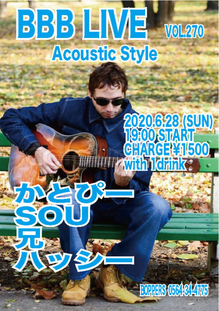 BBB LIVE 270 Acoustic Style 2020.6.28 (SUN) 19:00 START CHARGE \1500 with 1drink かとぴー SOU 兄 ハッシー