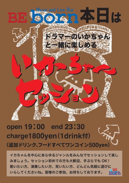 練馬music & live bar BEborn 日曜日の「お気楽ライブ」 出演者の皆様、いらしていただいたお客様、 ありがとうございます。 せっかくのライブですので、たくさんの皆様に見ていただけるよう、 BEbornチャンネルに公開しております。 ぜひ見てくださいね。 https://www.youtube.com/channel/UCfqNmJMFvK71B4fo8XwrPUA?view_as=subscriber BEbornチャンネルの登録もよろしくお願いします。 そして、 本日、6月30日(火曜日)は、 いかちゃんセッション】 open 19:00 end 23:30 charge 1,800円 (1ドリンク付) 自由なジ