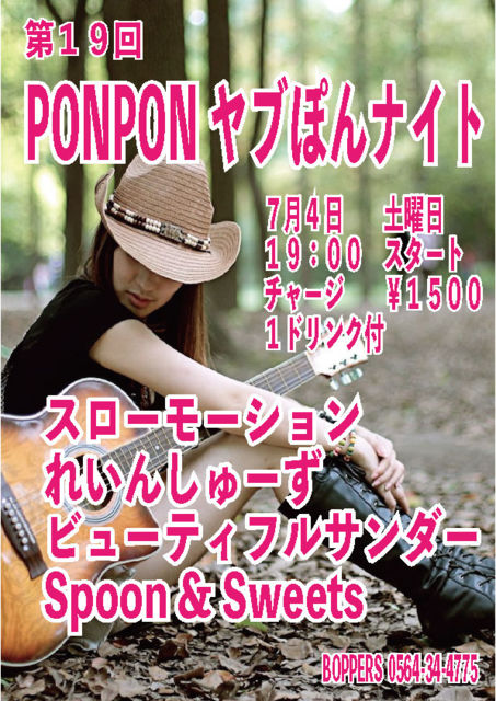 第19回 PONPONヤブぽんナイト 7月4日 土曜日 19:00 スタート チャージ ¥1500 1ドリンク付 スローモーション れいんしゅーず ビューティフルサンダー Spoon & Sweets