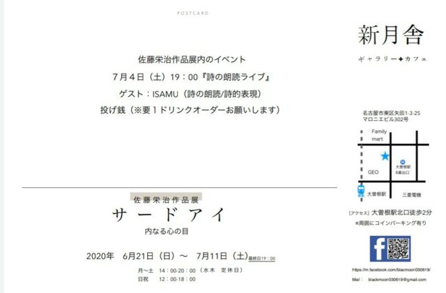 2020年6月21日(日)〜7月11日(土)まで大曽根駅から徒歩2分のギャラリー+カフェ 新月舎で開催の造形作家、佐藤栄治氏による作品展『佐藤栄治作品展 サードアイ 内なる心の目』。 様々な絵画作品、小物作品、人形作品等の造形作品、立体作品が展示されている佐藤栄治作品展内のイベントとして7月4日(土)に詩の朗読ライブが開催されます。 7月4日(土) 19:00 『詩の朗読ライブ』 ゲスト:ISAMU(詩の朗読/詩的表現) 投げ銭(1ドリンク注文お願いします) 写真1.佐藤栄治作品展 ポストカード 写真2.佐藤栄治作品展ポストカード(イベント案内入り裏面) 写真3.造
