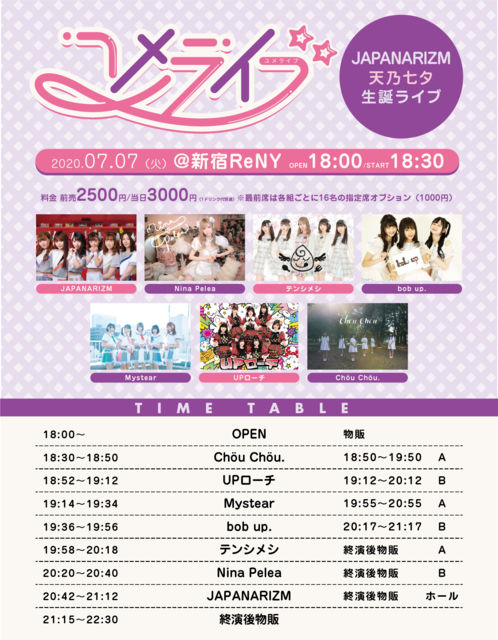 ¡Ö¥æ¥á¥é¥¤¥Ö¡×ŷǵ¼·Í¼À¸Ã¥饤¥Ö Æü»þ¡§07/07(²Ð) ³«¾ì18:00 / ³«±é18:30 ²ñ¾ì¡§¿·½ÉReNY ÎÁ¶â¡§Á°Çä2,500±ß / ÅöÆü3,000±ß(DÊÌ)¡¡¢¨ºÇÁ°Îó(³ÆÁÈ)16̾¸ÂÄê»ØÄêÀÊ(+1,000±ß¥ª¥×¥·¥ç¥ó) ½Ð±é¡§JAPANARIZM / Nina Pelea / ¥Æ¥ó¥·¥á¥· /b ob up. / Mystear / UP¥í¡¼¥Á / Chöu Chöu. ¥Á¥±¥Ã¥È¡§https://tiget.net/events/95328¡¡¢¨£±Æü(¿å)£²£±»þ¼õÉÕ³«»Ï ¡Ú¥¿¥¤¥à¥Æ¡¼¥Ö¥ë¡Û ½Ð±é¡§20:42¡Á21:12 ʪÈΡ§½ª±é¸å 21:15¡Á22:30¡¡¥Û¡¼¥ë