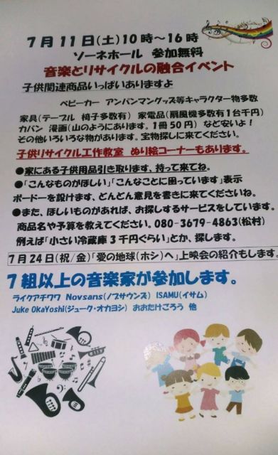 名古屋市北区山田に在る大曽根住宅1棟1階の総合店舗「ソーネおおぞね」内のイベントホール「ソーネホール」で開催のリサイクルショップによる掘り出し物市的な販売会と音楽ライブの融合イベント。 場所:「ソーネホール」(「ソーネおおぞね」内のイベントホール)名古屋市北区山田2丁目11-62 大曽根住宅1棟1階 --アクセス-- ・地下鉄名城線「大曽根」より約900m。 ・地下鉄名城線「平安通」より約900m。 ・地下鉄上飯田線「上飯田」より約1100m。 市バス栄15系統「山田」より約500m。 入場無料! ‐‐‐‐‐リサイクルショップ掘り出し物市‐‐‐‐‐