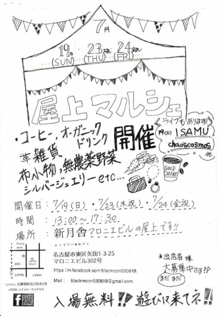 大曽根駅から徒歩2分の所に在る1階に「ケーキショップ プチ・フレーズ」2階に「ゲストハウスぷらっとほーむ」3階に「ギャラリー+カフェ 新月舎」が入るマロニエビルの屋上にて7/19(日)、7/23(木祝)、7/24(金祝)の3日間、マルシェを開催。 ※"公開絵師"武蔵人骨個展『紙とインクと人の呼吸』期間(7/13(月)〜7/26(日))内に開催。 ※注:ISAMUライブ出演日は7/19(日)のみ。 □7/19(日)※マルシェ自体は7/23(木祝)&7/24(金祝)も開催。 題名: 屋上マルシェ 場所: 東区(名古屋市)/矢田(大曽根駅前)「マロニエビル(屋上階)」 交通: 名古屋市東区矢田1丁目3