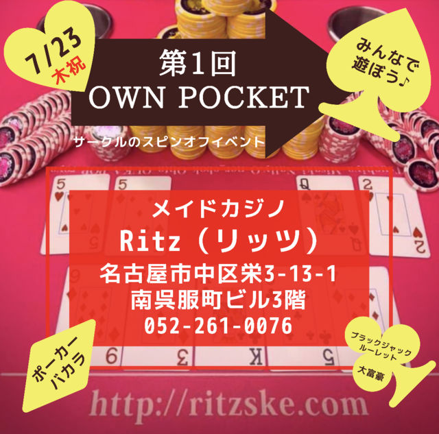 2020年7月23日(木祝)13:00〜23:00 人数制限無し ※お店のシステムに準ずる ◆急遽臨時開催◆ 第1回 OWN POCKET 「みんなでメイドカジノに行こう♪」 ◆◆◆◆◆◆◆◆◆◆◆◆◆◆ 参加できる方はコメント欄に 参加表明をご記入下さい。 キャンセルの連絡やご質問等は 1:1トークにてお気軽に♪ ◆◆◆◆◆◆◆◆◆◆◆◆◆◆ 自腹イベントですので自己判断で料金変わります。 たまにはサークルから抜け出して、色々なプレイヤーさん達とポーカーでぶつかってみませんか? 第1回は、名古屋市中区栄3丁目にある メイド&ガール