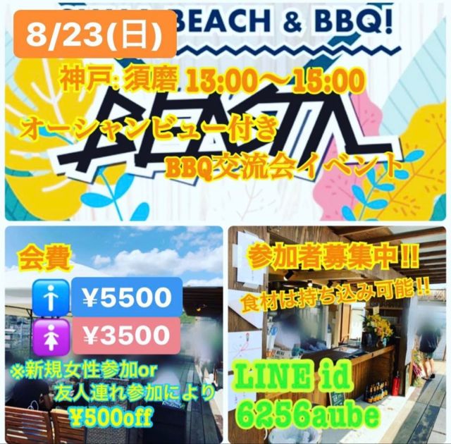 管理人様、貴重なスペース失礼します。 8/23(日)神戸:須磨の海から歩いて1分もかからないビアバーでバーベキューイベントを開催します♪ 8月23日(日) 神戸:須磨オーシャンビュー付き豪華BBQイベント もうすぐやってくる夏!! 夏といえば、海だ!!祭りだ!!いや、BBQだー!! 8月後半は夏の締めくくりとしてBBQイベント開催致します(≧∇≦) 8月23日(日)昼間 ☆神戸:須磨海岸のビアバーにてBBQ交流会イベントを開催致します。 ☆13:00開催15:00終了となっております。 ☆途中参加退室可能です! ☆メニューはバ