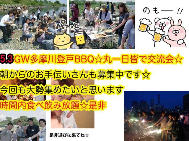 コロナがあるので50名で締め切ります8.16(日曜)登戸多摩川BBQ丸一日です☆人気です皆で楽しみましょう☆朝からのお手伝い大募集します☆毎年食べ飲み放題状態です☆去年はお子さんも11名遊びに来てくれました☆ サークルの様子です↓ユーチューブです https://youtu.be/nb5FsRjMd9U ☆ 朝からのお手伝い大募集します☆毎年食べ飲み放題状態です☆ ☆ 橋げたの下のなので小雨決行 豪雨中止 うちのイベントのコンセプトは ☆ 横浜 神奈川は当たり前として、 都内や埼玉。千葉からいらっしゃいます☆ 毎回年齢層幅広く