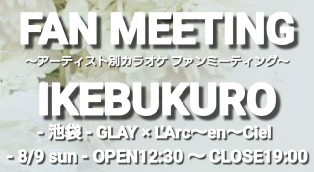 ★PR動画★ https://youtu.be/oh5_AfYN6WY 皆さん、はじめまして(*´ω`*) 最近はライブもなかなか難しい時期で、 ファンの皆さんとの交流も出来ないのがちょっと寂しいですね。 もし宜しければカラオケ会と題して、ファン ミーティングで一緒にカラオケ楽しみませんか? どのぐらい集まって頂けるかわからないので、GLAY好きな人達とL'Arc好きな人を8人ずつメンバー募集したいと思います。 お