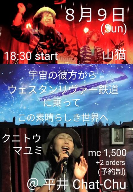 2ユニットによるアコースティックイベントです。 ☆クニトウマユミ ウクレレ弾き語り&朗読 ☆山猫 山田健人 _ vo. 猫村はいじ _ agt. date 2020年8月9日(日) op 17:30 st 18:30 18:30〜19:30 クニトウマユミ 20:00〜21:00 山猫 セッションタイム少し 以降打ち上げ チャージ 1500円+2オーダー 【新型コロナ感染症予防対策】 感染および拡大予防策として当店では ・入店時、退店時のアルコールジェルでの手指消毒 ・ご入店のお客様へご氏名と緊急連絡先の記録 ・大声での会話厳禁 ・お連れ様以外のお