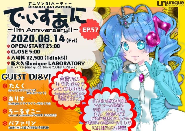 AnimeSong¡Ü¦Á DJ Party ¡Ö¤Ç¤£¤¹¤¢¤Ë EP.57 ¡Á11th Anniversary!!¡Á¡× at Shin Okubo unique LABORATORY 2020.8.14(fri) OPEN/START 23:00 CLOSE 5:00 ¢¨¥³¥¹¥×¥ì»²²Ã¤ÎÊý¤Ï22:30¤è¤êÀè¹ÔÆþ¾ì²Ä entrance¡§\2,500(with1drink) GUEST DJ¡õVJ ¤¢¤ê¤¹ ¤¿¤ó¤¯ ¥Ð¥Õ¥¡¥ê¥ó ¤í¡¼¤ë¤¹¤³¡¼ ¢¡¤Ç¤£¤¹¤¢¤Ë DJ/VJ/STAFF¢¡ POGI youthaqua É÷Íø ÅÅǾ¾¯½÷¤Ï¡¼¤Á¤ã¤ó¡£ ¾®ÂÀϺ ¤¦¤Ë ¤ä¤È&