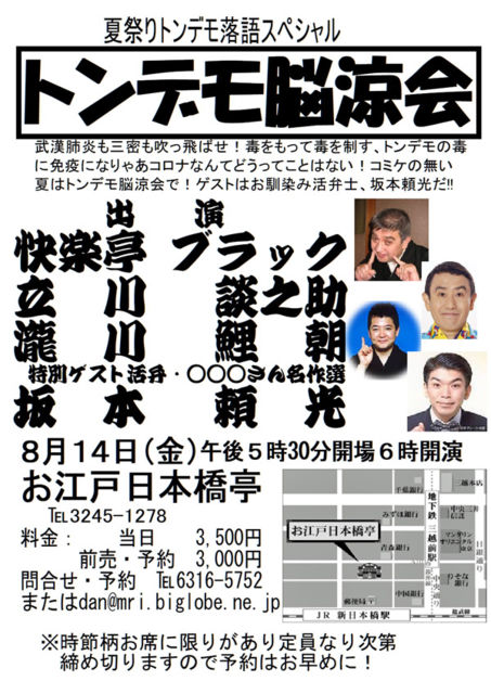 ¡¡²Æº×¤ê¥È¥ó¥Ç¥âÍî¸ì¥¹¥Ú¥·¥ã¥ë¡Ø¥È¥ó¥Ç¥âǾÎòñ¡Ù ¥ª¥ê¥ó¥Ô¥Ã¥¯¤ä¥³¥ß¥±¤¬Ìµ¤¯¤È¤â¥È¥ó¥Ç¥â¤Ï¤ä¤ë¤¼¡ª Æü»þ¡§£¸·î£±£´Æü(¶â)¸á¸å5:30³«¾ì¡¡6:00³«±é ²ñ¾ì¡§¤ª¹¾¸ÍÆüËܶ¶Äâ¡¡ä03-3245-1278 ½Ð±é¡§²÷³ÚÄâ¥Ö¥é¥Ã¥¯¡¡Î©ÀîÃÌÇ·½õ¡¡ÂíÀî¸ñÄ«¡¡ ¥¹¥Ú¥·¥ã¥ë¥²¥¹¥È¡¡¥È¥ó¥Ç¥â³èÊۻΡ¡ºäËÜÍê¸÷ ÎÁ¶â¡§Í½Ìó3,000±ß¡¡ÅöÆü3,500±ß ͽÌó¡¦Ìä¹ç¤»¡¡ä¡¡03-6316-5752¡¡ ¡¡¡¡¡¡¡¡¡¡¡¡¡¡mail¡¡dan@mri.biglobe.ne.jp »þÀáÊÁ¤ªÀʤËÀ©¸Â¤¬¤¢¤ê¤Þ¤¹¡£ÅöÆü¤Ç¤ÏÆþ¾ì¤Ç¤¤Ê¤¤ ¾ì¹ç¤¬¤¢¤ê¤Þ¤¹¤Î¤ÇͽÌó¤Ï¤ªÁá¤á¤Ë¡£