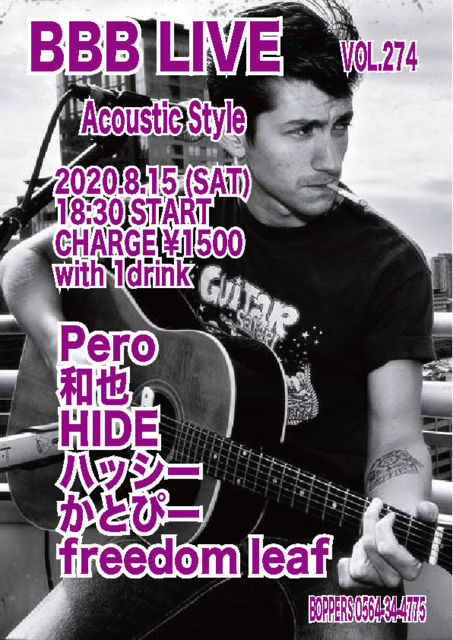 BBB LIVE 274 Acoustic Style 2020.8.15 (SAT) 18:30 START CHARGE \1500 with 1drink Pero ÏÂÌé HIDE ¥Ï¥Ã¥·¡¼ ¤«¤È¤Ô¡¼ freedom leaf
