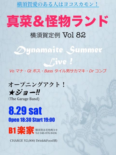 8月29日(土) 真菜&怪物ランド 横須賀定例ライブ82 会場 横須賀 楽家 開場 18時30分 開演 19時 料金 2000円 ※オープニングは三浦のジョー。