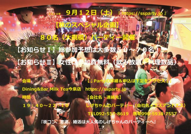 ¡Ú¤ªÃΤ餻¡Û¸ø¼°¥Û¡¼¥à¥Ú¡¼¥¸¢Í¡Ø https://ssparty.jp ¡Ù ¡¼¡¼¡¼¡¼¡¼¡¼¡¼¡¼¡¼¡¼¡¼¡¼ ¡Ú´ë²è¡Û ¡ü£¹·î£±£²Æü¡ÊÅÚ¡Ë ¡ú¡Ú½©¤Î¥¹¥Ú¥·¥ã¥ë´ë²è¡Û£¸£°Ì¾¡ÊÂ絬Ìϡ˥ѡ¼¥Æ¥£¡¼ ¡ý¡Ú¤ªÃΤ餻µ¡ÛÁí»²²ÃͽÁÛ¤ÏÂç¿¿ô£µ£°¡Á£·£°Ì¾¡ª ¡ý¡Ú¤ªÃΤ餻¶¡Û½÷À¤Ï»²²ÃÈñ̵ÎÁ ¡ý¡Ú¤ªÃΤ餻·¡ÛËÜÆü¤Î£±£·:£³£°°Ê¹ß¤Î¿½¹þ¤Ï¸æÅÅÏáʷÈÂӤءˤǤª´ê¤¤Ãפ·¤Þ¤¹¡£¡Ô¡ùľÀÜ¡¢ÅÓÃæ»²²Ã¤âOK¡ù¡Õ ¡¼¡¼¡¼¡¼¡¼¡¼¡¼¡¼¡¼¡¼¡¼¡¼ ¡Ú²ñ¾ì¡Û ¡üDining&Bar Milk Teaº£ÀôŹ¡Ê¥ß¥ë¥¯¥Æ¥£¡¼¡Ë ¡ú¤ªÅ¹ÀâÌÀ¡á²Ú¤ä¤«¤µ¤ÈÂç¿Í¤ÊÊ·°Ïµ¤¤¬Í»¹ç¤·¤¿¤ªÞ¯Íî¤ÊŹÆâ¡£¡ö¤ªÞ¯Íî¤Ê