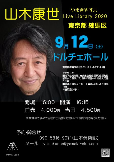 「山木康世 Live Library 2020」 会場=ドルチェホール https://www.piano-g.co.jp/service/hall.html 東京都練馬区高松6-35-15 しのだビル5階 アクセス= ■地下鉄成増駅(東武東上線成増駅)成増町停留所より西武バス [練42][吉60] 高松大門通り下車 ■大江戸線光ヶ丘駅 下車後A4出口より徒歩10分 ※笹目通り沿い 開場=16:00 開演=16:15 前売=4000円 当日=4500円 ※飲食可ですので自由にご持参ください。ゴミはお持ち帰りください。 予約=090ー5316ー9071(山木倶楽部九段支部) メール/